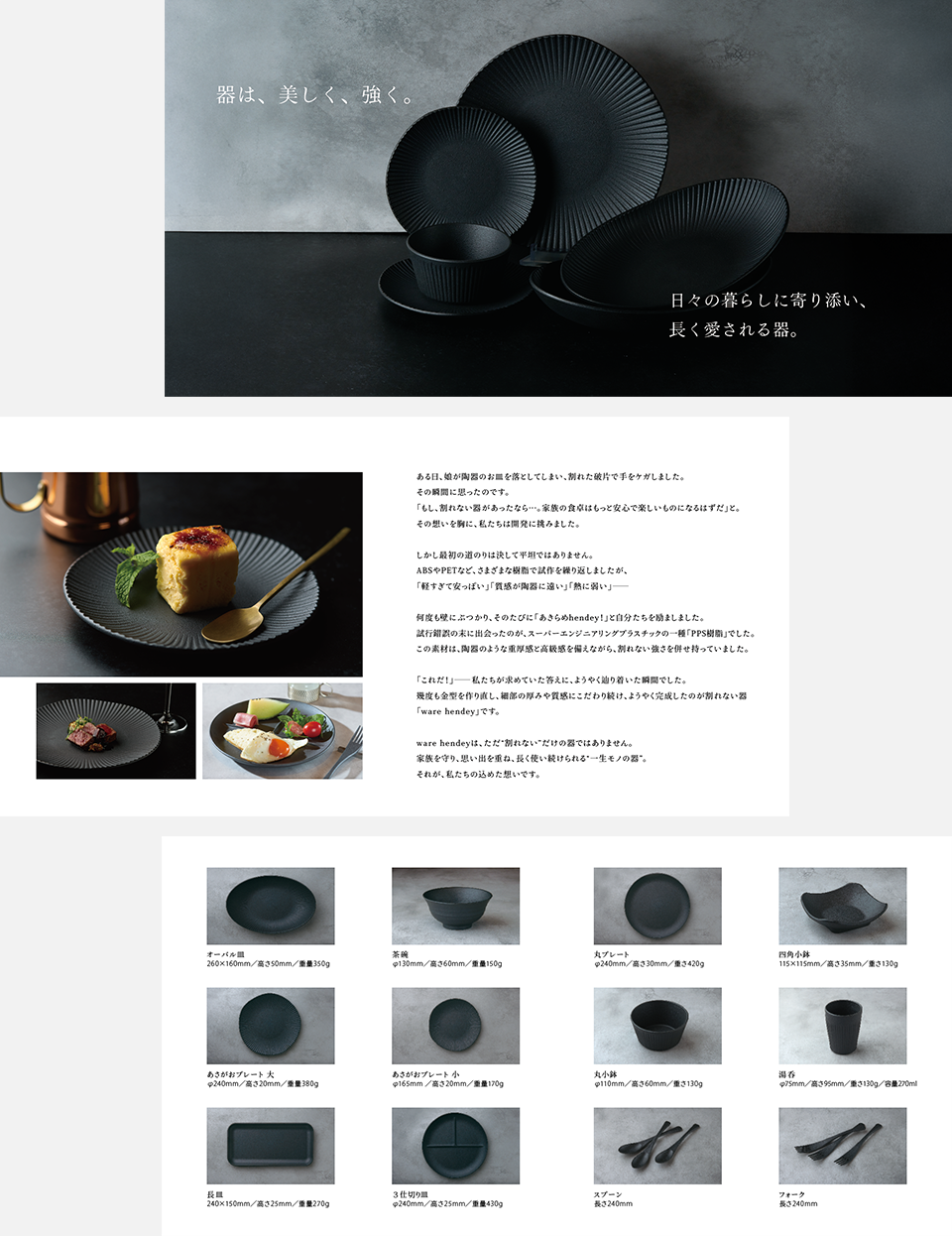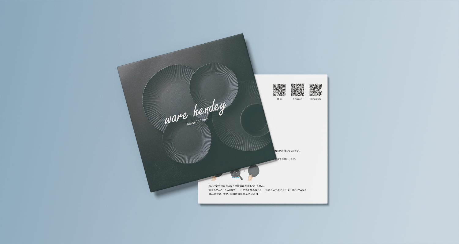 黒い食器ブランド「ware hendey」の紹介パンフレットを、CDサイズ・8ページでデザインしました。 誕生ストーリーや盛り付け例を通して、ブランドの世界観を上品に表現しました。 手に取るお客様に、“黒の器の豊かさ”が静かに伝わる構成に仕上げています。